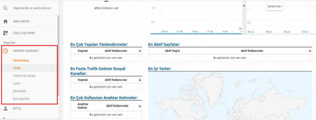 Yukarıda yer alan görselde sağ kırmızı kutucuk Google Analytics üzerinden “Gerçek Zamanlı” verilere ulaşabileceğiniz alandır. Buradan gerçek zamanlı birçok veriyi çok kolay bir şekilde anlık olarak görüntüleyebilirsiniz. Ayrıca bu verileri rapor haline de getirebilirsiniz.